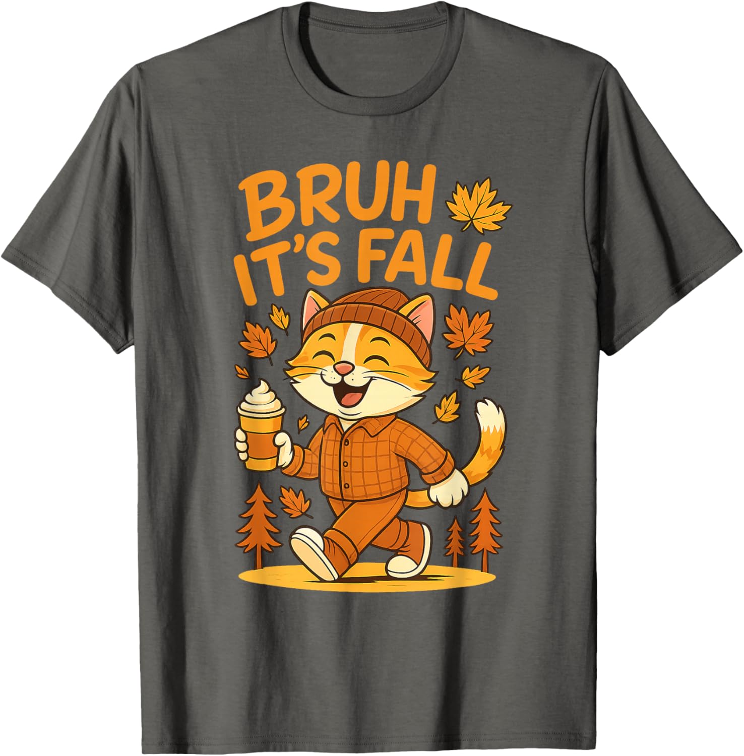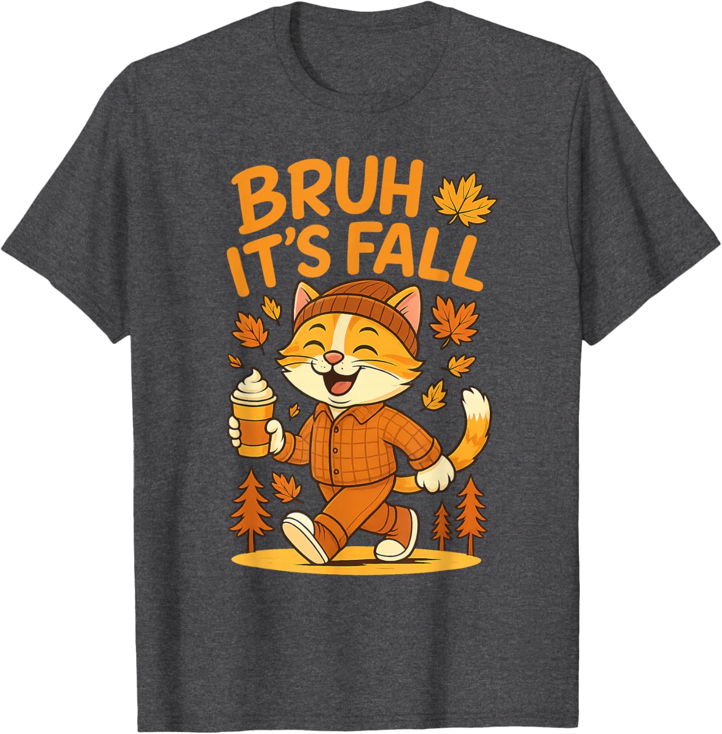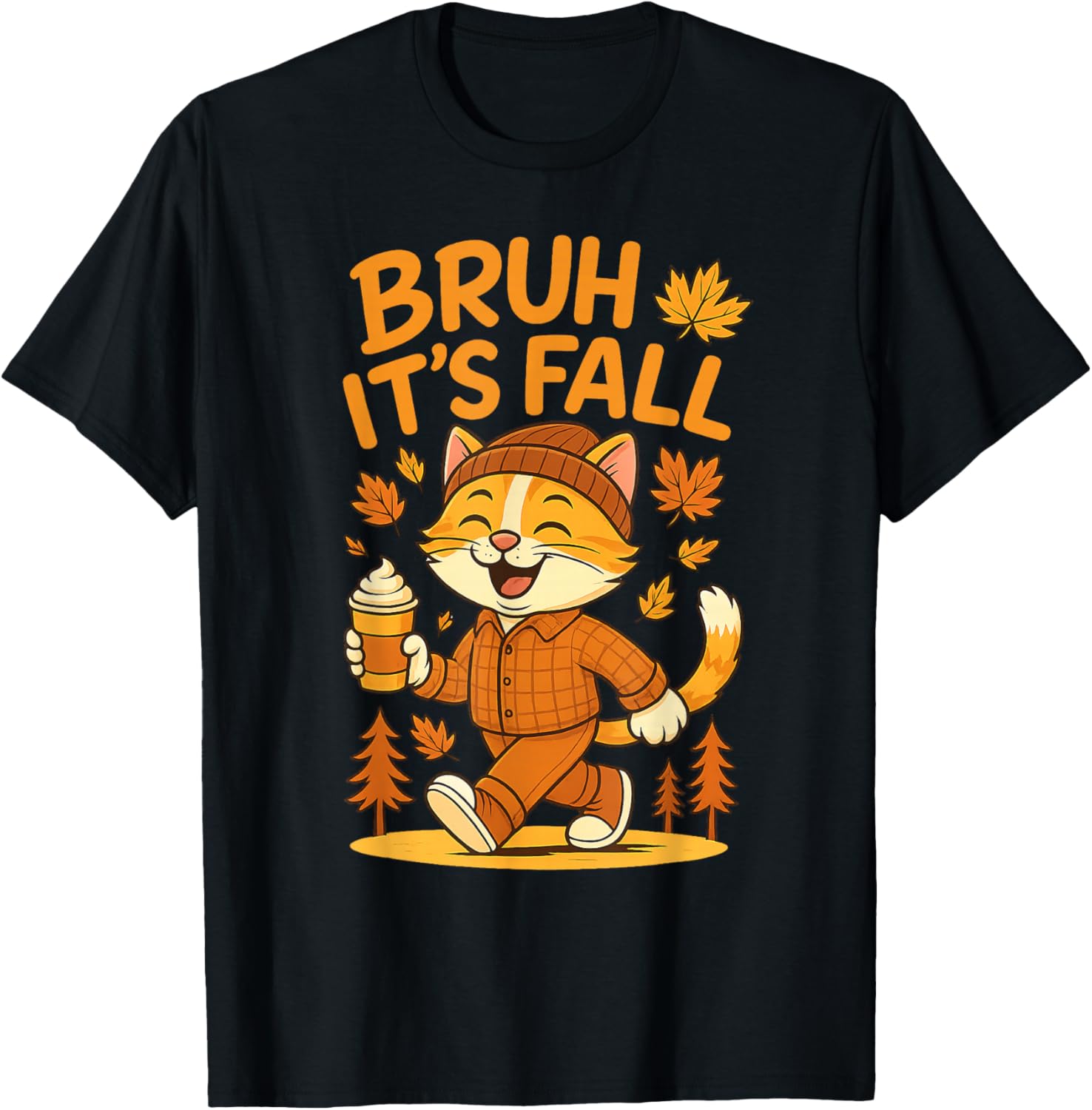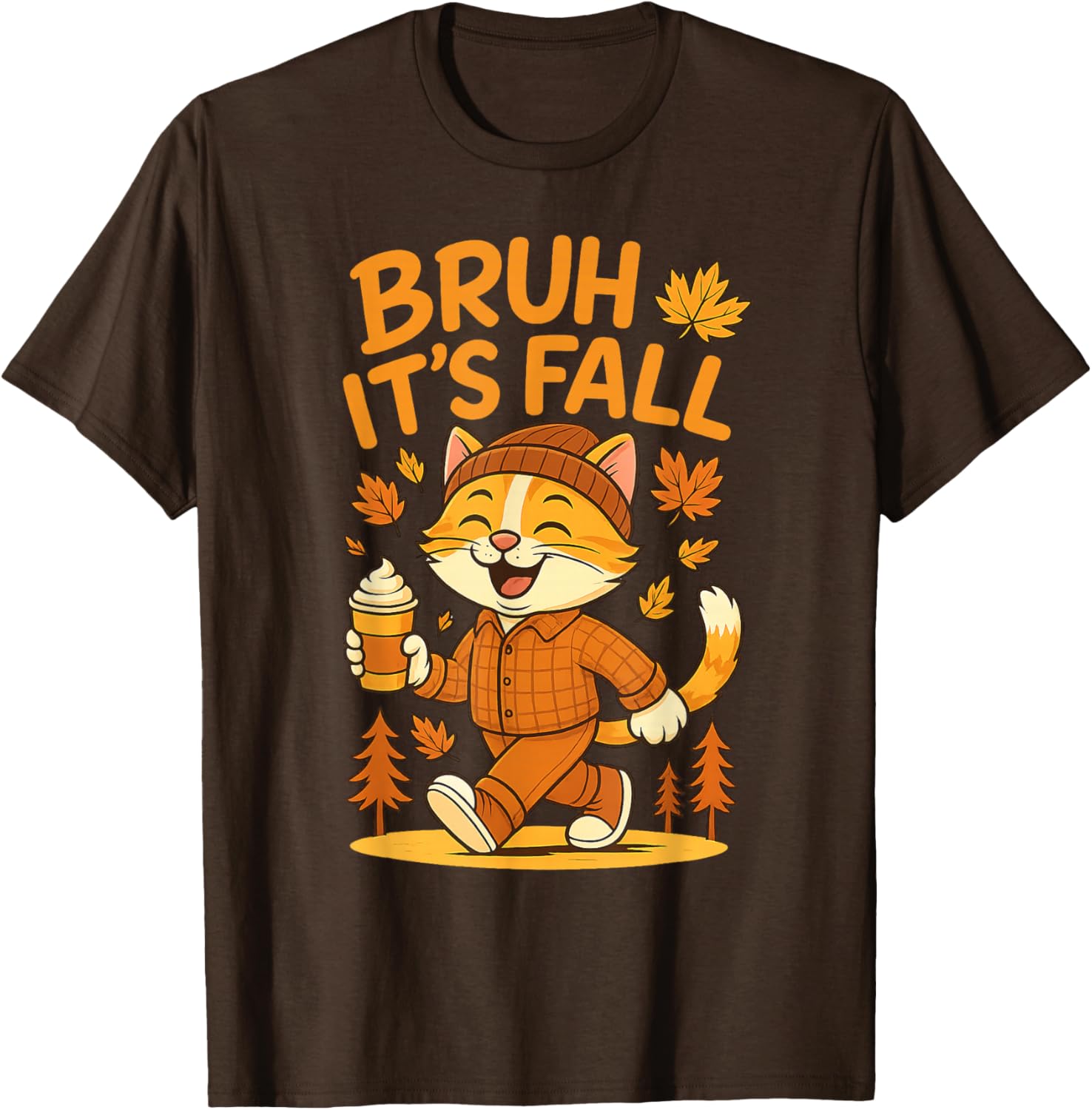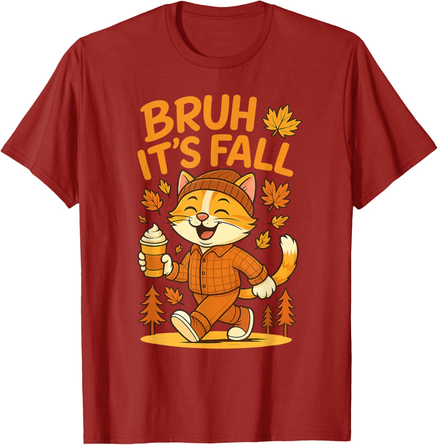 Get ready for autumn with this Bruh It’s Fall T-Shirt! Featuring a cheerful ginger cat in a brown plaid flannel shirt and beanie, happily holding a pumpkin spice latte, this design captures the cozy fall spirit. Surrounded by colorful autumn leaves and evergreen trees, the bold retro text Bruh It’s Fall makes this tee a fun seasonal statement.Designed for cat lovers, pumpkin spice fans, and fall enthusiasts, this shirt blends humor, comfort, and vintage-inspired style. The warm orange and brown tones create a cozy vibe that pairs perfectly with your favorite jeans, hoodie, or jacket.Whether you’re visiting a pumpkin patch, enjoying a latte at your favorite café, celebrating Thanksgiving, or dressing up for a casual Halloween outing, this shirt is your go-to fall outfit. It also makes a thoughtful gift for friends, family, students, or coworkers who can’t get enough of autumn.Celebrate the season, embrace the cozy vibes, and show off your love for cats, coffee, and fall with this unique design.