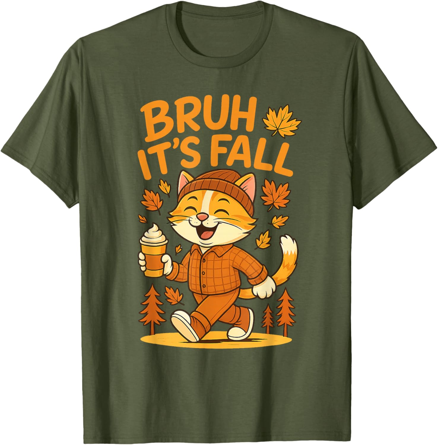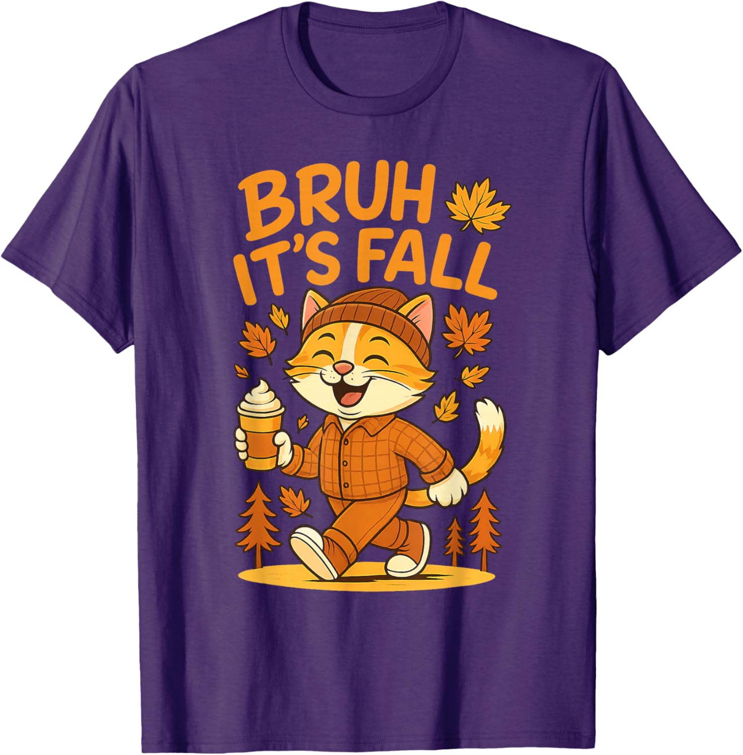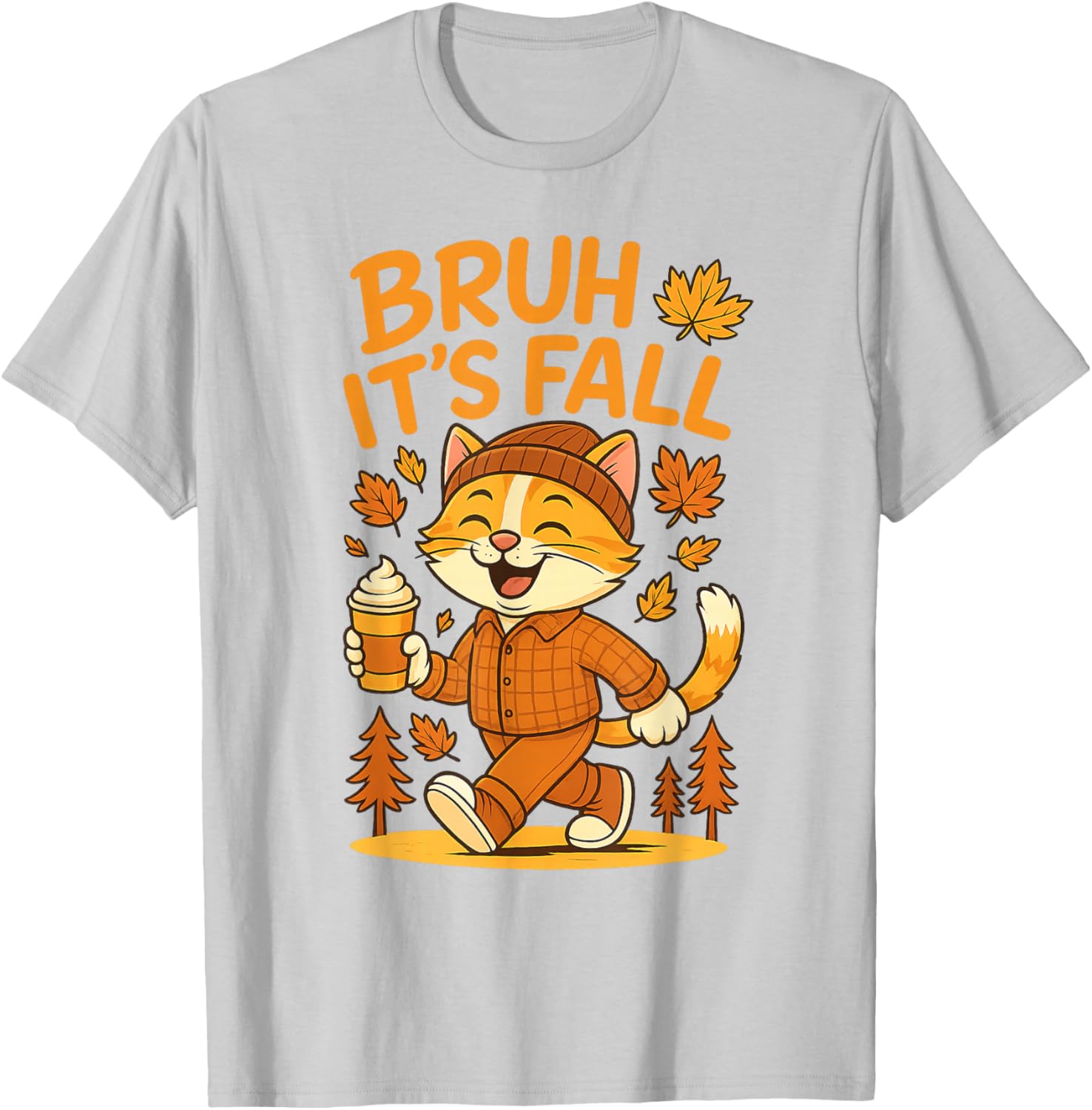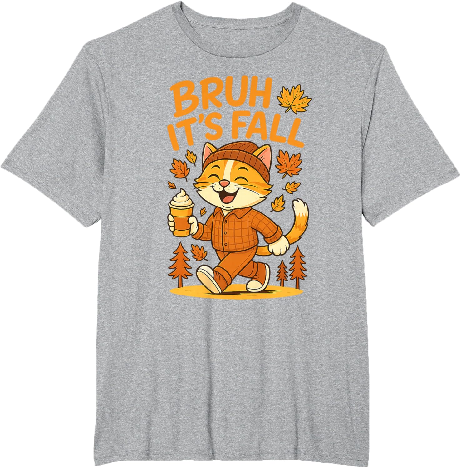 Get ready for autumn with this Bruh It’s Fall T-Shirt! Featuring a cheerful ginger cat in a brown plaid flannel shirt and beanie, happily holding a pumpkin spice latte, this design captures the cozy fall spirit. Surrounded by colorful autumn leaves and evergreen trees, the bold retro text Bruh It’s Fall makes this tee a fun seasonal statement.Designed for cat lovers, pumpkin spice fans, and fall enthusiasts, this shirt blends humor, comfort, and vintage-inspired style. The warm orange and brown tones create a cozy vibe that pairs perfectly with your favorite jeans, hoodie, or jacket.Whether you’re visiting a pumpkin patch, enjoying a latte at your favorite café, celebrating Thanksgiving, or dressing up for a casual Halloween outing, this shirt is your go-to fall outfit. It also makes a thoughtful gift for friends, family, students, or coworkers who can’t get enough of autumn.Celebrate the season, embrace the cozy vibes, and show off your love for cats, coffee, and fall with this unique design.