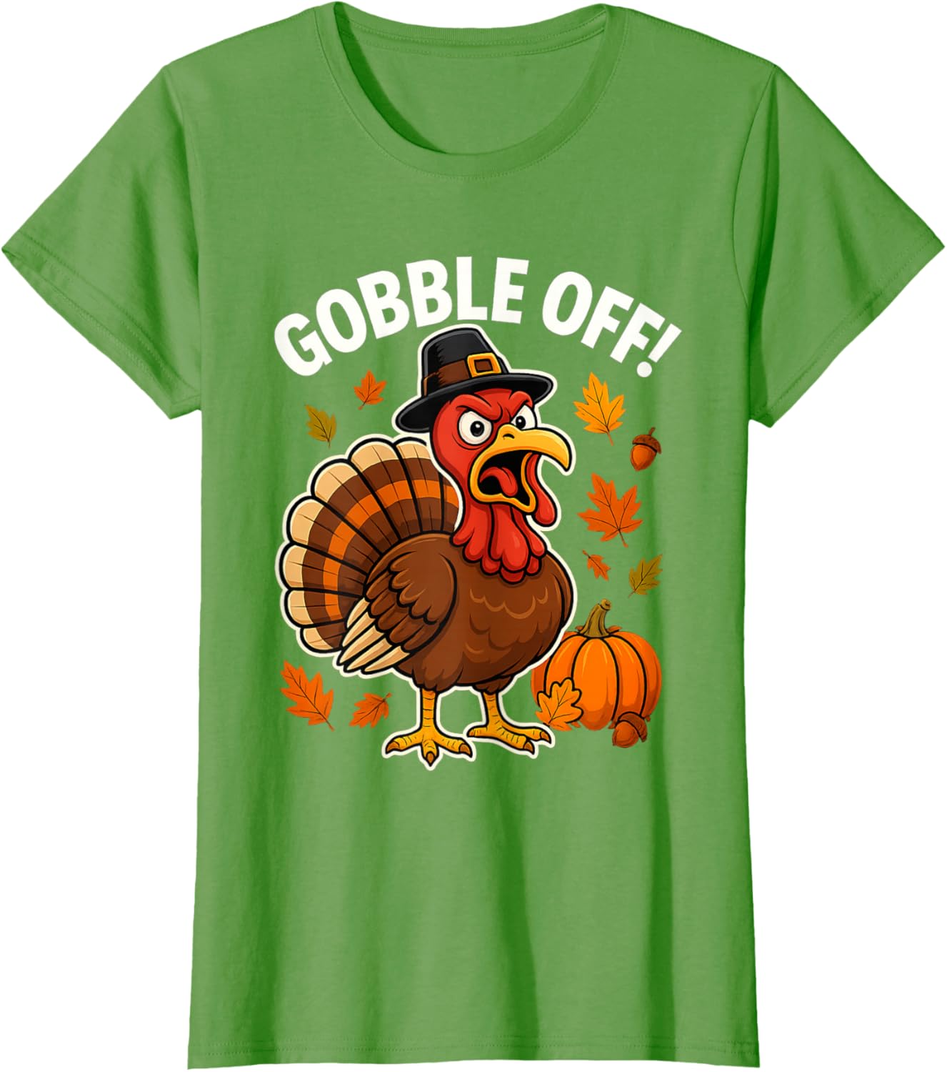 - Bold, original angry turkey cartoon with solid orange GOBBLE OFF! headline and Thanksgiving icons (pumpkins, corn, leaves). High-contrast white outline prints clean and stands out on any shirt color.